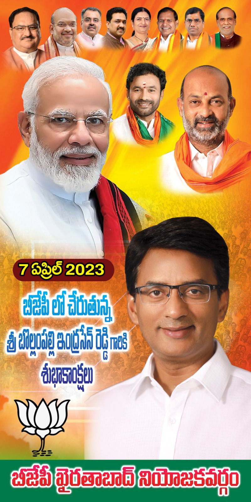 "I am honoured and humbled by the trust and confidence that the BJP party leadership has shown in me by welcoming me into their fold. I am excited to work with the dedicated and hardworking members of the BJP party to serve the people of our country. I am committed to working towards the party's goals and objectives." Bollampally Indrasena Reddy spoke on this occasion.